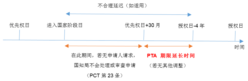 如上文所述,对于PCT申请,在不合理延迟D的计算中,申请日需以进入中国国家阶段日为准。但根据PCT条约第23条,除非申请人明确请求,指定局不应在优先权日(PRI)起30个月的期限届满前进行处理。也就是说,如果申请人在优先权日30没有要求提前处理,那么在进入国家阶段到优先权日后30个月届满之间的这段时间,国家知识产权局不会处理这一申请。按上述规定,这段时间需要在补偿期中扣除。