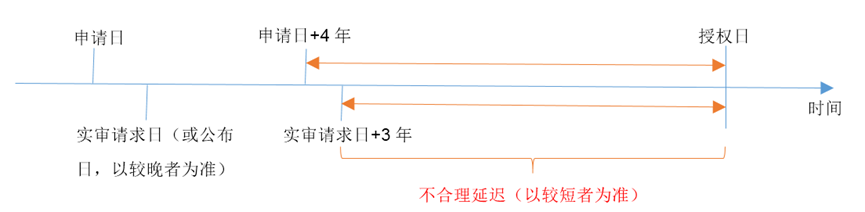 不合理延迟是指授权日与申请日、实审请求日相比过于滞后的情形。具体的计算方法为:自申请日起满四年且自实审请求日起满三年的日期至授权日之间的时间。当公布日晚于实审请求日时,以公布日起算。总之,不合理延迟为申请日+4年、实审请求日+3年和公布日+3年这三个日期中最后者到授权日之间的时间。