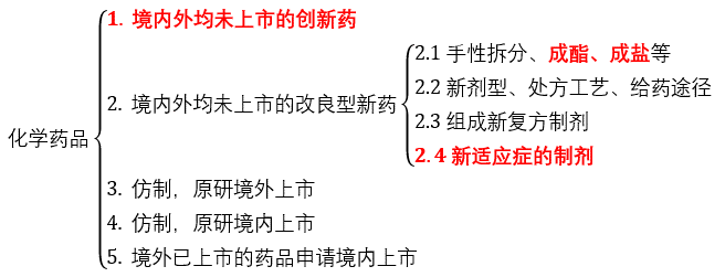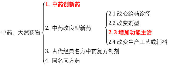 按《审查指南》规定,创新药的含义“依照有关法律法规并按照国务院药品监督管理部门的相关规定确定”。此处的“相关规定”可以理解为药监部门发布的中国药品注册分类标准,按中药(天然药物)、化学药品和生物制品三大类各自规定了细分标准。若作此理解,结合《审查指南》中对“符合规定的改良型新药”的规定,我们将可以适用PTE的药品类别梳理如下(标红为适用PTE的):