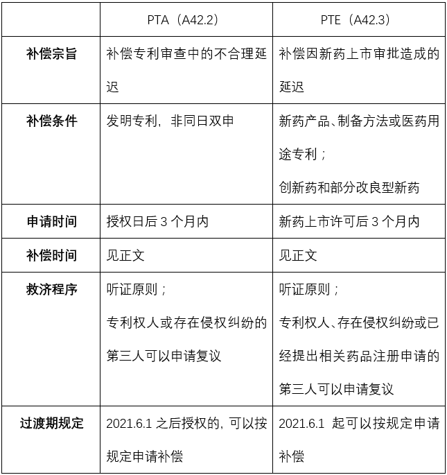 根据专利法第四十二条第二、三款,中国的专利权期限补偿分为:因发明专利授权过程中的不合理延迟给予的补偿(第四十二条第二款,以下简称PTA),以及因新药上市审评审批占用时间给予的补偿(第四十二条第三款,以下简称PTE)两种。