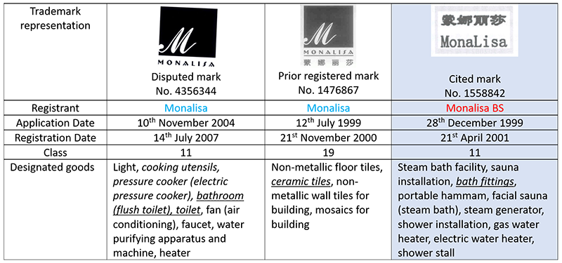 (“MonaLisa in Latin & Chinese”) owned by Monalisa BS in class 11, Monalisa BS and Monalisa BW jointly alleged that the disputed mark and the cited mark are similar trademarks registered on similar goods, which is in violation of Article 28 of the 2001 Trademark Law.