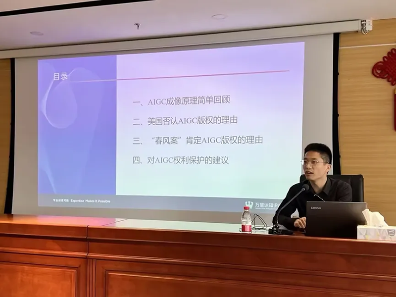 Mr. Zhang firstly prepares the floor on the technical principle of AIGC, elaborating on the process as to how AIGC identifies, learns, analyses and generates images. He then compares the difference of the Chinese and US methodology in ascertaining copyrightability of AIGC and shares his perspective toward the originality assessment of AIGC from a case law perspective. The lecture is concluded with takeaways over the strategy on how to build a sound intellectual property portfolio surrounding AIGC.