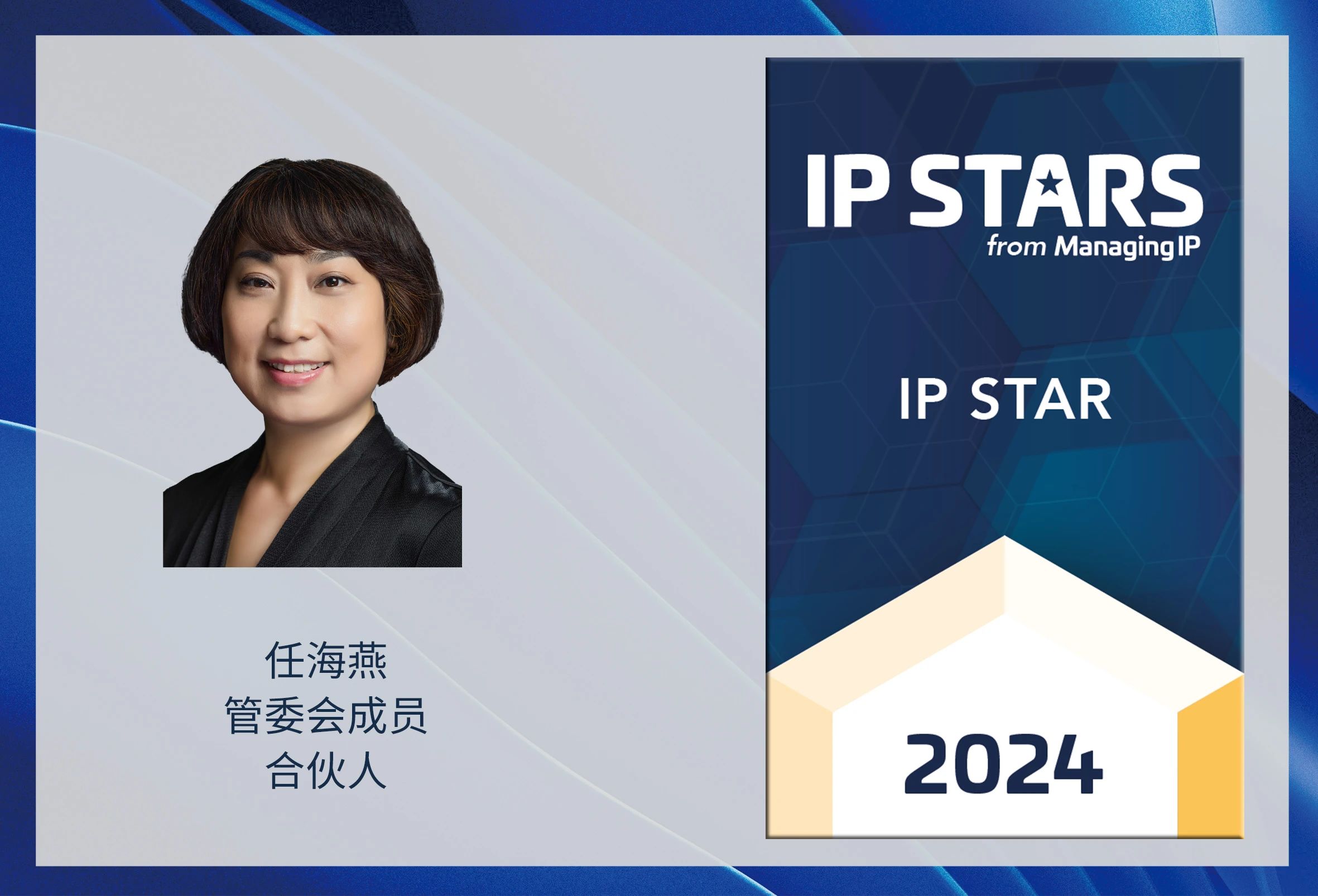万慧达管委会成员、合伙人任海燕女士连续五年获评“MIP知识产权领域杰出女性”(Top 250 Women in IP 2024)称号。