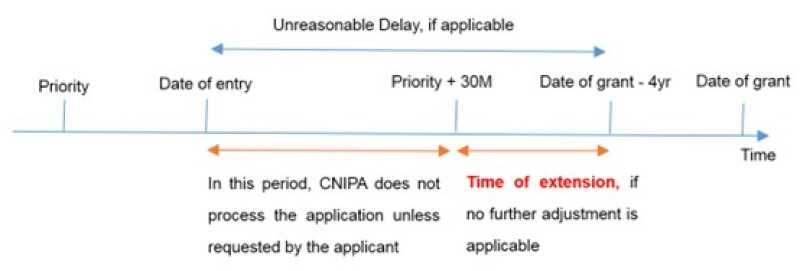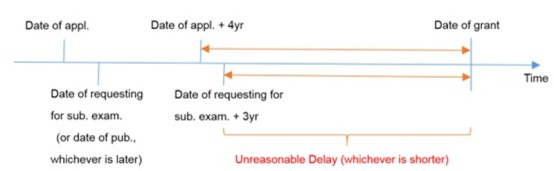 An unreasonable delay in the prosecution process refers to an undue delay in the date of grant. It is defined as the interval between “four years after the date of application”, “three years after the date of requesting substantial examination”, “three years after the date of publication”, whichever is later, and the date of grant.