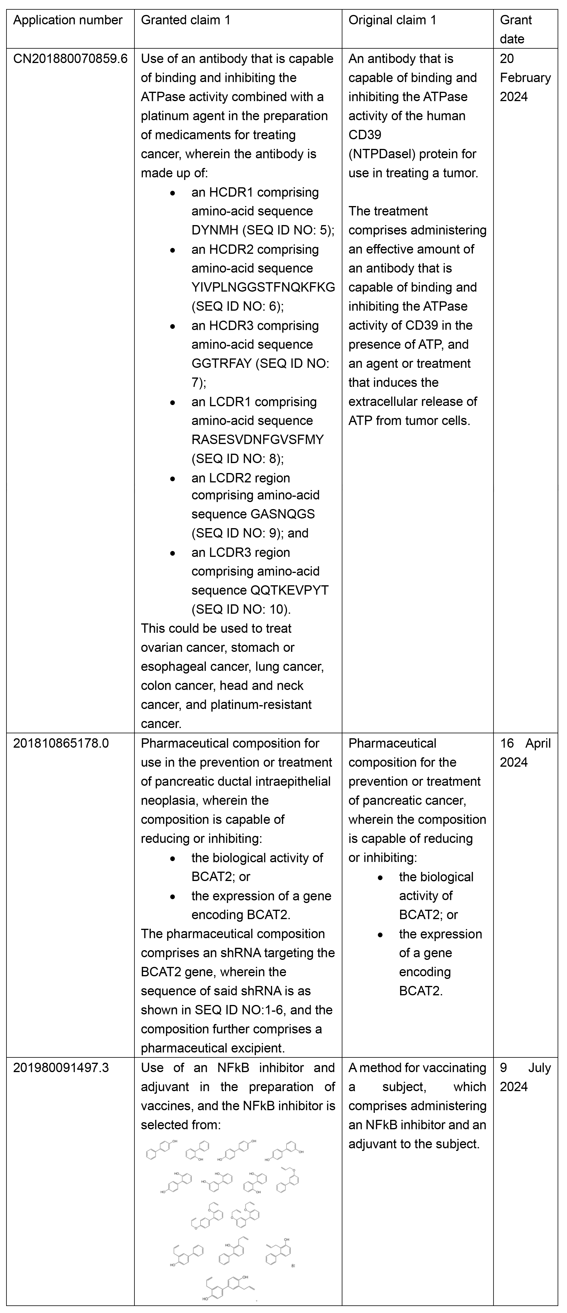 Over the years, the China National Intellectual Property Administration (CNIPA)’s examination practice on this issue has shifted. In most cases, the CNIPA used to allow the pharmaceutical use of biomarker-derived agents, which were drafted to cover a broad scope of protection, as long as the pharmaceutical effect of the target is new. This led to the smooth granting of patents in the last 10 years with biomarker-related features, broadly defined as ‘inhibitor’, ‘antagonist’ or ‘agonist’. Although some were further defined with functional features, most had a reasonably satisfactory protection scope. See below for some examples.