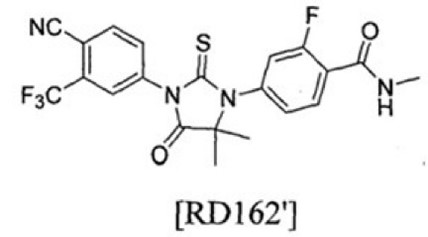 The patent at issue is related to an enzalutamide compound (the chemical formula is shown below) titled "Diarylhydantoin compounds". It is RD162' in the patent at issue.