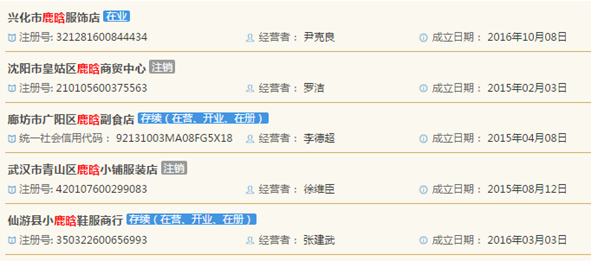根据全国企业信息网资料,目前全国已有10多家企业名称中包含“鹿晗”,经营范围覆盖到影视演出,化妆品,服装饰品,日用百货,家居用品,食品、饮料、酒、烟、日用百货零售,投资咨询,技术服务,室内外装饰装潢工程,蔬菜种植等领域。其中,2013年9月2日成立的鹿晗贸易(上海)有限公司是诸多企业中最早成立的,而鹿晗投资的南京鹿晗影视文化工作室则成立于2014年10月30日,稍晚于前者成立。