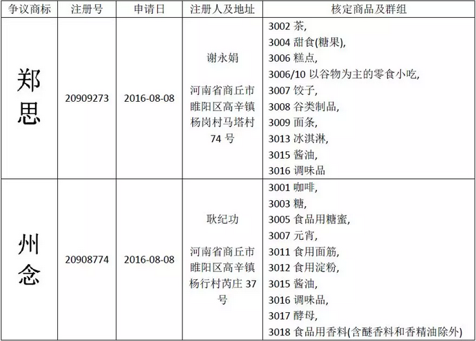 谢永娟和耿纪功(简称“被申请人”)两个自然人于同一日在第30类分别申请注册了“郑思”和“州念”商标(简称“争议商标”),情况如下: