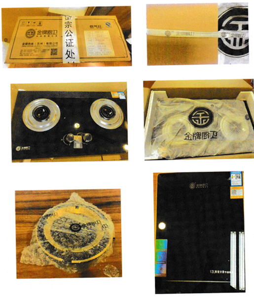 ”。金牌厨柜公司对苏州金牌公司网站进行了网页公证,并对侵权样品进行公证购买。被控侵权燃气灶具、燃气热水器产品的捆扎带、胶带、包装箱箱体上均有“