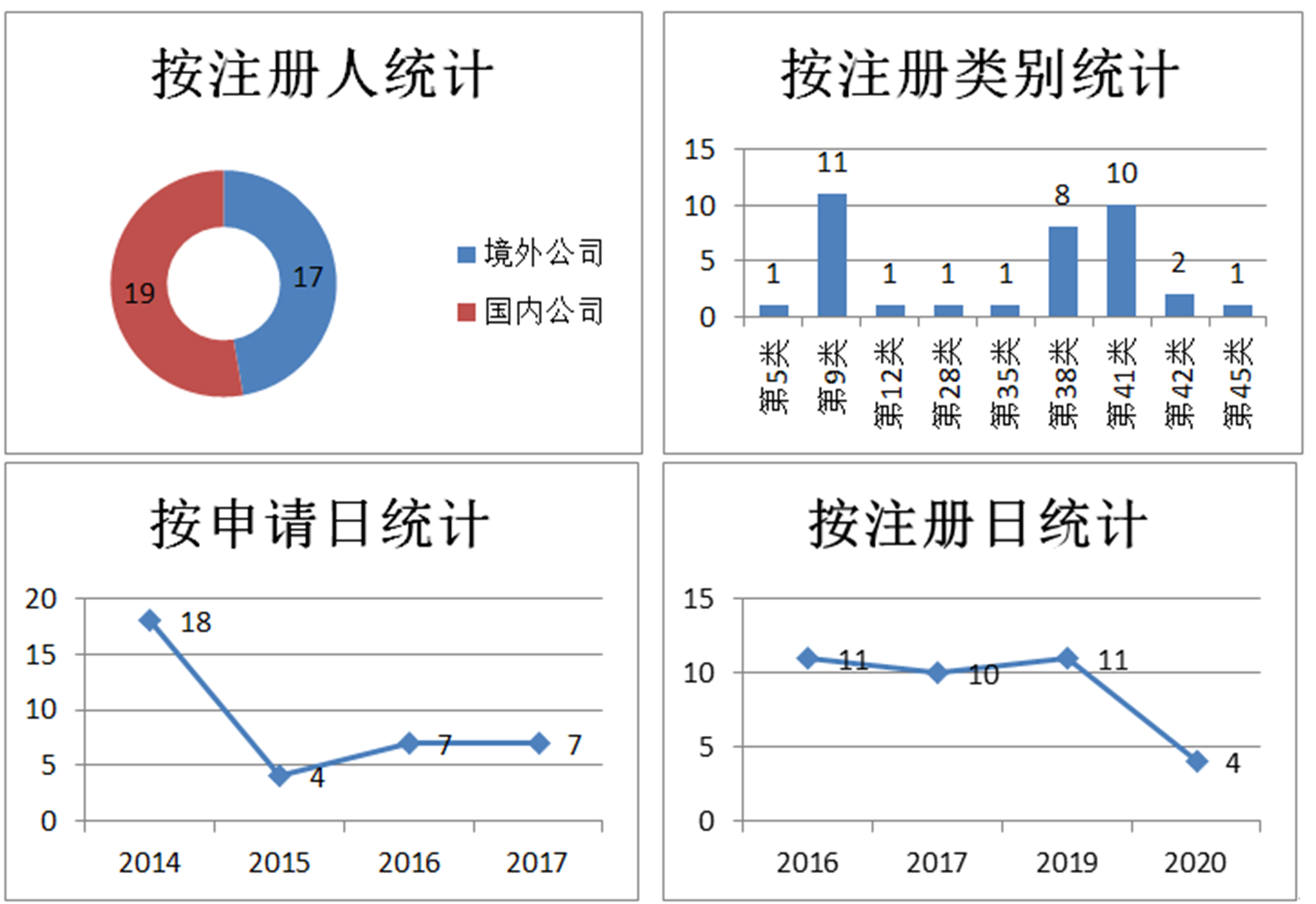 统计维度:上述图表为按照注册人、注册类别、申请日、注册日维度统计的商标注册量