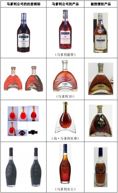 原告马爹利股份有限公司是历史悠久的烈酒生产商,其“马爹利/MARTELL”是法国著名的干邑品牌。自2005年起,马爹利公司陆续对其主要产品的瓶形申请了平面图形商标或立体商标,并获准注册。经过马爹利公司长期、持续的使用和广泛、深入的宣传推广,这些产品及其酒瓶对应的商标、包装装潢在酒类行业及相关公众中具有较高的知名度。