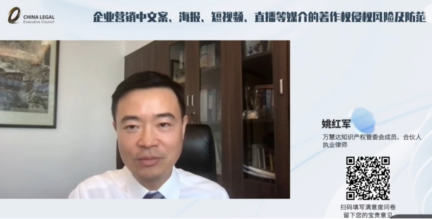 本次培训由姚红军律师主讲,就平台学员所关心的“企业营销中文案、海报、短视频、直播等媒介的著作权侵权风险及防范”话题,结合丰富实务经验进行讲授。