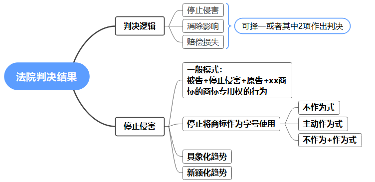 许多案件中,法院的判决结果会由“停止侵害+消除影响+赔偿损失”三个部分共同构成。但有些情况下,法院仅会选择其中1项进行判决。比如,法院可能仅判决被告停止侵害,而不再判决消除影响和赔偿损失,而有时又仅会判决赔偿损失;再有时,会选择其中2项进行判决,比如会判决赔偿损失和消除影响,或者判决被告停止侵害和赔偿经济损失。