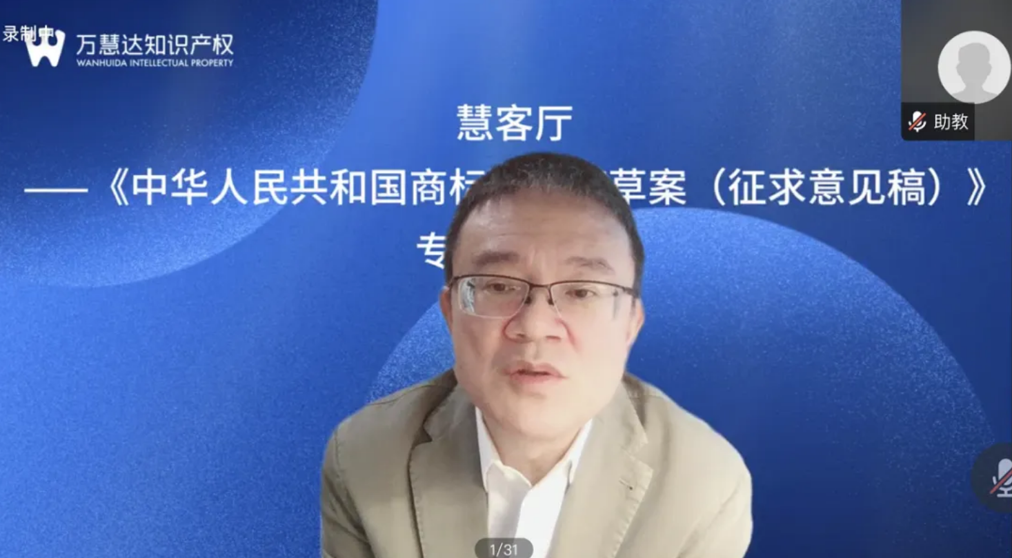 万慧达管委会成员、合伙人黄晖博士在线上发表致辞,介绍了本次修改草案的背景与主要修订内容。随后,合伙人李运全律师、朱志刚律师、明星楠律师、张涵律师,管委会成员、合伙人李斌律师,分别针对恶意注册、使用义务、保护条件、抗辩事由和程序衔接五个专题进行了深入解读。
