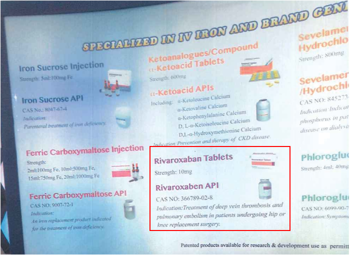 1、被控侵权人在第十八届世界制药原料药中国展(以下称“CPhI展会”)上以展板、散发产品宣传资料等方式对包括利伐沙班片剂及利伐沙班原料药在内的产品进行宣传推介,并配有包装盒及包装瓶照片。