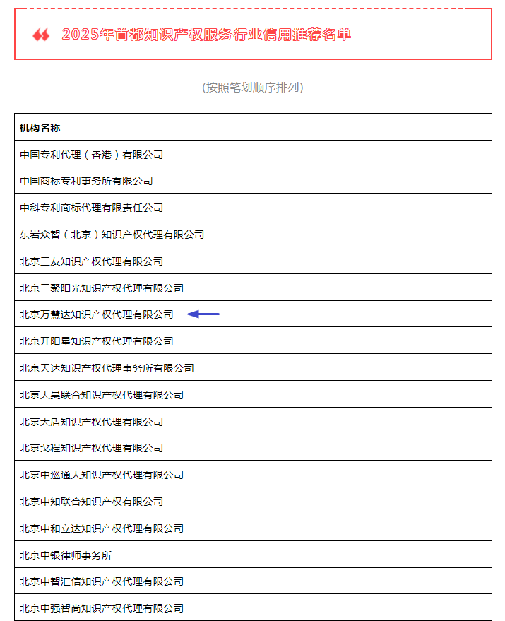 2025年2月26日,首都知识产权服务业协会发布了“2025年首都知识产权服务行业信用推荐名单”,北京万慧达知识产权代理有限公司、北京市万慧达律师事务所因具备诚实守信、规范执业等素质,通过了协会四届二次理事会审议,上榜推荐名单。