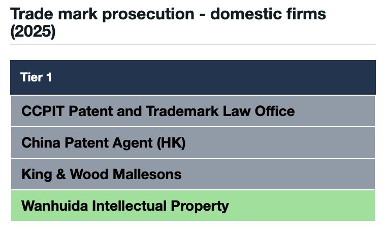 万慧达知识产权继续保持了商标业务方面的优势,连续十五年荣列“商标确权”和“商标诉讼”两大板块中国区第一梯队。