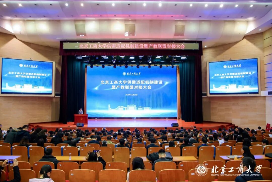 2025年11月26日,以“聚焦供需适配,深化产教融合”为主题的“北京工商大学供需适配机制建设暨产教联盟对接大会”在良乡主校区盛大举行。中国轻工业联合会党委书记、会长张崇和,中国法学会党组成员、副会长王振江,教育部学生服务与素质发展中心副主任程卫星,北京市教育委员会副主任张耀天,房山区政府副区长陈仲秋出席大会并致辞。来自北京市人社局、北京市高校就业创业指导中心、北京市就业促进中心,以及13个行业108家企业的领导和嘉宾参会。