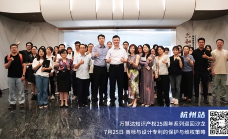 Wanhuida holds second 25th anniversary salon in HangzhouJuly 25 2024Wanhuida holds second 25th anniversary salon in HangzhouOn 25th July 2024, the “Enforcement Strategy of Trademark and Design Patent Salon” is held in Hangzhou. The event, which is jointly organized by Wanhuida Intellectual Property and in-house membershi...July 25 2024 -