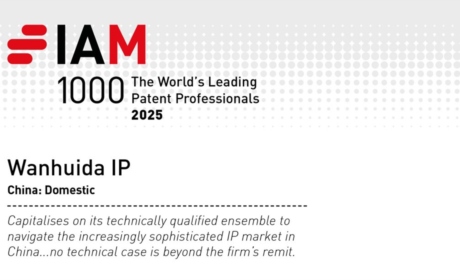 Wanhuida and 6 partners ranked by IAM 20252025.05.29Wanhuida and 6 partners ranked by IAM 2025On 29th May 2025, IAM unveils the 2025 edition of IAM Patent 1000: The World’s Leading Patent Professionals. Now in its 14th year, the IAM Patent 1000 helps identifying top patent professionals and f...2025.05.29 -